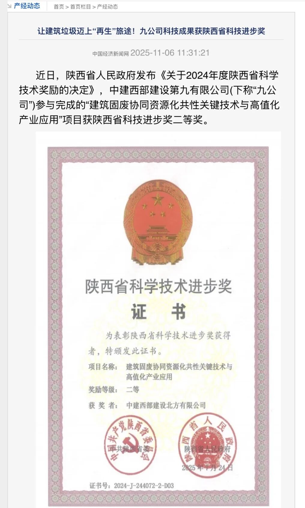 近日,陕西省人民政府发布《关于2024年度陕西省科学技术奖励的决定》,中建西部建设(002302)九公司完成的“建筑固废协同资源化共性关键技术与高值化产业应用”项目获陕西省科技进步奖二等奖。