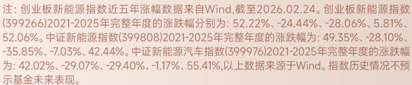 自指数基日(2017.12.29)以来,创业板新能源指数上涨270.13%,年化收益率达18.03%,大幅跑赢中证新能源等同类指数,历史表现展现强劲进攻性,长期投资有望取得丰厚回报。近五年来,创业板新能源指数年度涨幅为2025年52.06%、2024年5.81%、2023年-28.06%、2022年-24.44%、2021年52.22%。另外,创新能源上市公司均来自于创业板,单日最高可达20%涨跌幅,整体弹性相对其他新能源指数更大。(不作为投资建议,指数历史表现仅供参考,不预示未来表现亦不代表具体基金表现,市场有风险,投资需谨慎)